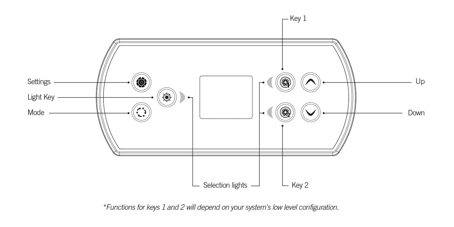 Included Overlay Button Layout: Settings/Light/Mode/Pump 1/ Pump2/Up/Down
