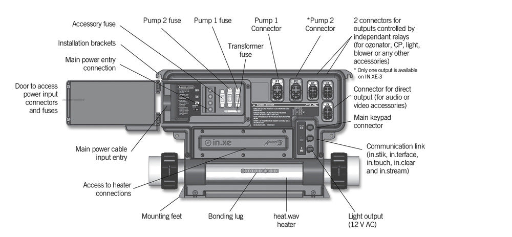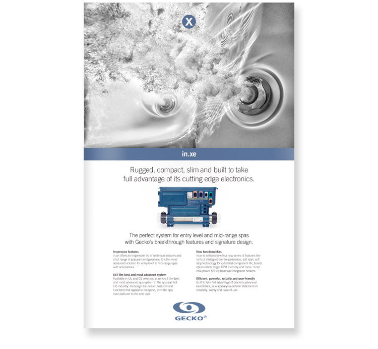 Gecko IN.XE-5-12 offers a full range of popular configurations and can power spas equipped with a single or dual pump system, a blower, a circulation pump, an ozone generator, a mood light and a heat. wav heater.