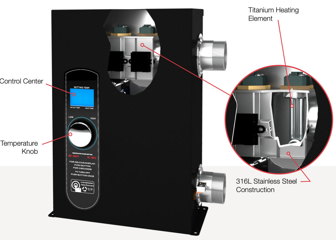 The Electric 3-Series Titanium heater is the latest technology in pool and spa heating. The E3T is built with titanium heating elements and 316L stainless steel to withstand extreme pool water conditions, including salt water chlorinated pools. The E3T heater operates by utilizing the latest solid-state design and flow sensor technology. It has easy to use digital controls with diagnostics. The compact size makes it easy to install for new construction or replacement installation.