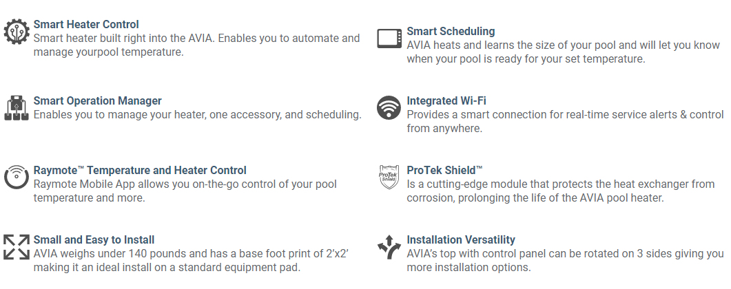 Managing your pool heater has never been easier or smarter. AVIA is built with an innovative Wi-Fi enabled control system that allows you to manage your pool heater with one accessory through the Raymote app – so no need for a separate control panel to manage your pool heater.